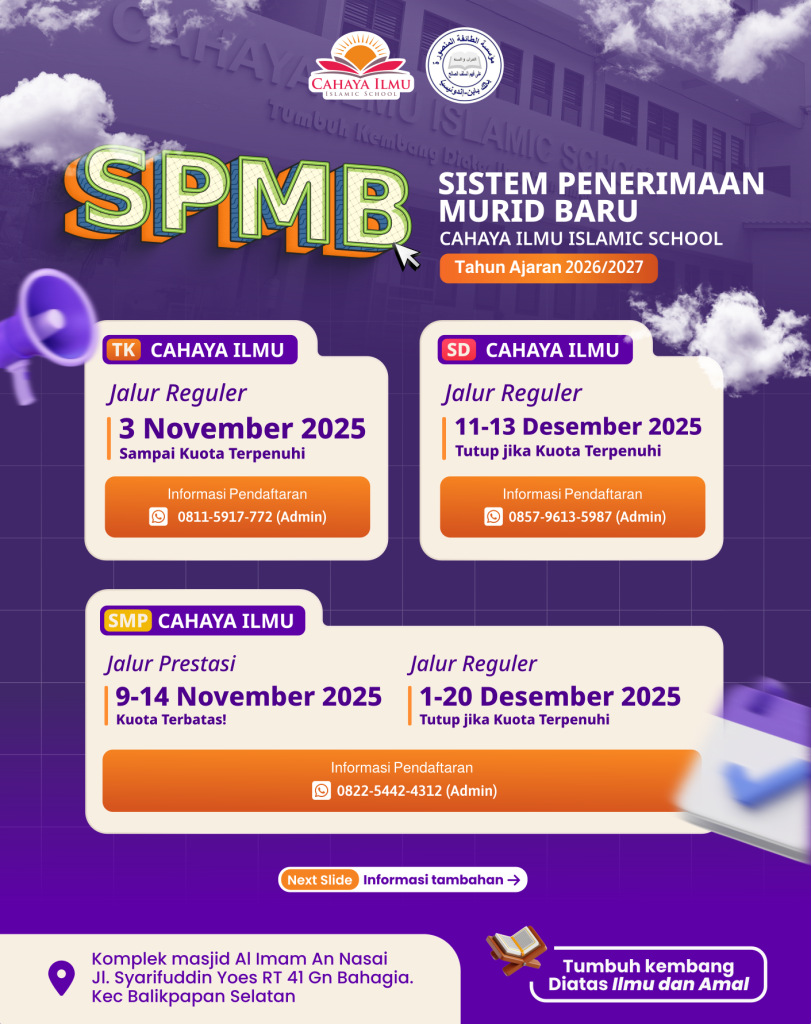 INFO SPMB TK-SD-SMP Islam Cahaya Ilmu Balikpapan Tahun Ajaran 2026 – 2027